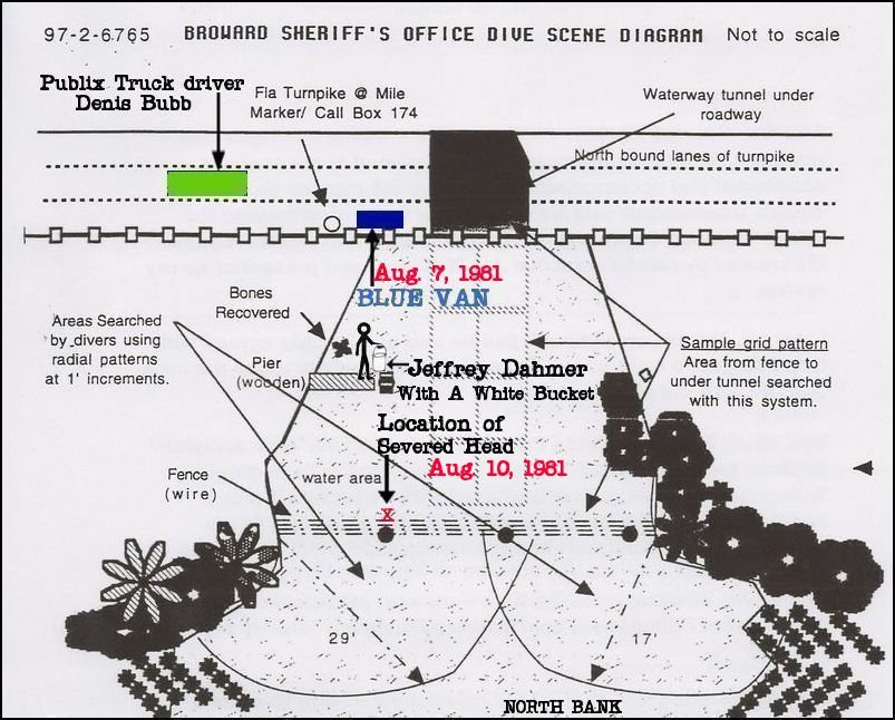 Dahmer, was seen on this bridge just past midnight, at 00:30 am, on August 7, 1981, three days before the head was found on August 10, 1981. That witness, a Publix supermarket truck driver, said he had seen a white male with a flashlight, taking something “round” out of a “white bucket” and throwing it into the water. He also observed a “Blue Van” parked on the shoulder of the road with the middle passenger-side door open. On August 11, when he heard on the news about the severed head being found at this location, he called the Hollywood Police. They dismissed him with, “Yea, Yea, we already know about the blue van... It has nothing to do with the Adam Walsh case.”